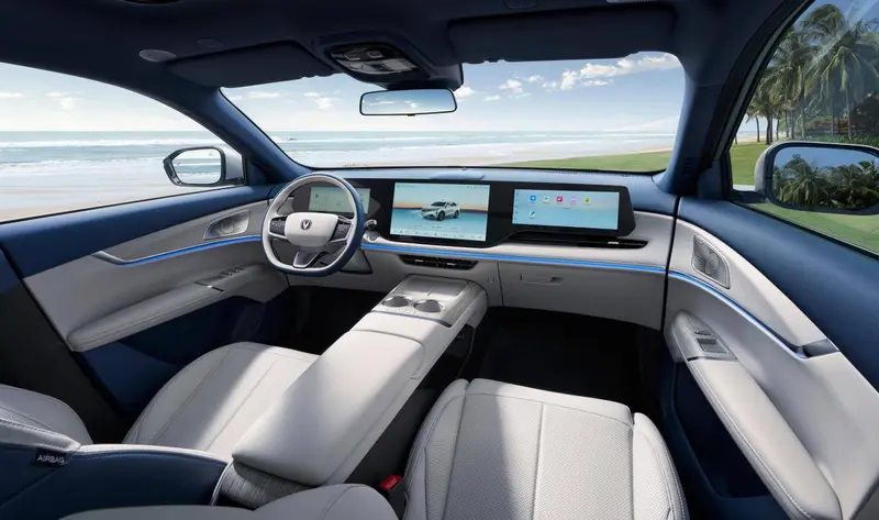 除了好开,还要好看!新车采用全新纵横万象美学设计,V波涟漪前脸以舒展的水平线条勾勒出水波初平的灵动基底。全系标配前后贯穿式LED数字瀑布光柱与发光徽标,尾部配备驭风电动尾翼,搭配18英寸烈焰光刃轮毂与低滚阻轮胎,实现出色的制动、操控与舒适性。车身提供炫影灰、月光白、月归蓝、萤石灰4种金属漆车色;内饰提供金曜黑、神秘红、紫砚白3款双拼色治愈系,尽显“都会生活家”从容哲学。